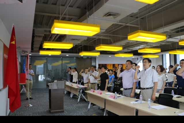 大会的最后,与会的全体党员在李建昌同志的带领下,面对党旗,庄严举起右手,重温入党誓词。