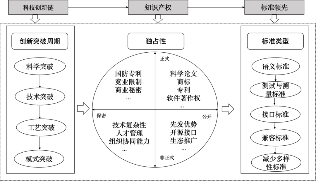 在未来产业尚处于形成期和争夺期的条件下,如何通过知识产权全球布局把技术优势转化为标准优势,从而实现未来产业全球竞争力至关重要。围绕这一目标,可依据“科技创新链—知识产权—标准领先”的逻辑框架(如图1所示)布局全球知识产权。该框架的核心在于:未来产业科技创新全链条是漫长过程,沿着“科学突破—技术突破—工艺突破—模式突破”四个关键节点不断突破推进,在不同突破阶段中,知识产权布局需要围绕“正式与非正式独占机制、保密与公开策略”两个战略维度进行动态组合;其最终目标是推动未来产业在“语义—测试与测量—接口—兼容—减少多样性”五个阶段实现标准领先。
