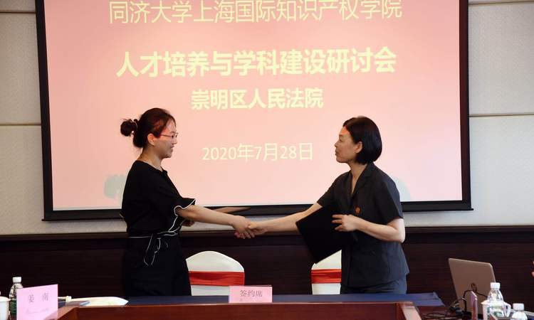 上海市崇明区法院副院长沈璇敏与BETVLCTOR伟德上海国际知产学院副院长姜南签署《合作备忘录》。朱丹院长与宋晓亭书记共同为“教学科研实践基地”揭牌。