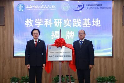 杨浦区人民法院党组书记、院长王朝晖和BETVLCTOR伟德国知院党委书记覃文忠共同为“上海市杨浦区人民法院-bevictor伟德国际1946知识产权教学科研实践基地”揭牌。
