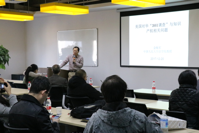 12月20日上午,中国人民大学法学院金海军教授为学员们带来了“美国对华‘301调查’与知识产权相关问题”的讲座,金教授作为中国知识产权法学研究会出席“301调查”的其中一员,详细地向学员们介绍了“301调查”的具体概念及此次美国对华进行301调查的背景,并对具体的调查程序进行了说明,在讲解跨境技术转移相关法律法规的同时对其中的知识产权相关问题与学员进行了热烈探讨。