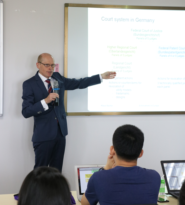 为期两天的授课过程中,Bacher法官大致介绍了欧盟和成员国知识产权的法律框架、法院构成体系、知识产权侵权损害赔偿的制度和执行、证据制度等等。此外,Bacher法官详细列举了损害赔偿的计算方法、证人出庭的情形和六个相关案例等内容。就证据规则而言,Bacher法官分析了审理知识产权案件中证据的可采性和一般原则。就诉讼程序而言,Bacher法官展示了诉讼过程中的不同阶段,解释了专家辅助人出庭作证的制度。就损害赔偿方法而言,Bacher法官解释了永久禁令和临时禁令两种情形,还和同学们一起讨论欧洲法院和中国法院在审理知识产权案件中适用禁令的不同。尽管课程仅仅为期两天,但是Bacher法官从专业的角度为学生介绍了十分丰富且具体的实务经验,给同学们的学习带来极大的帮助。