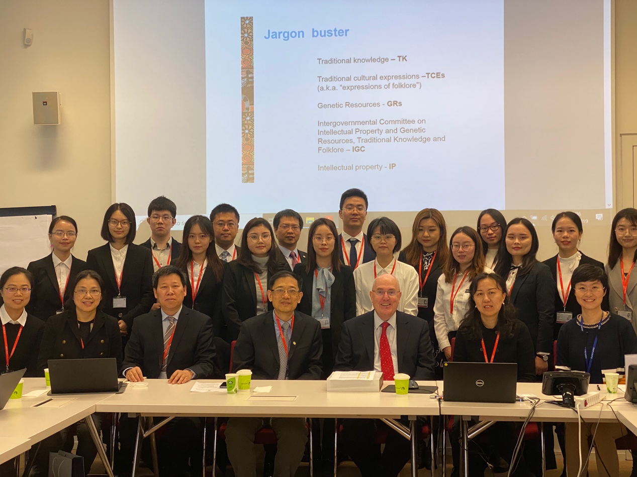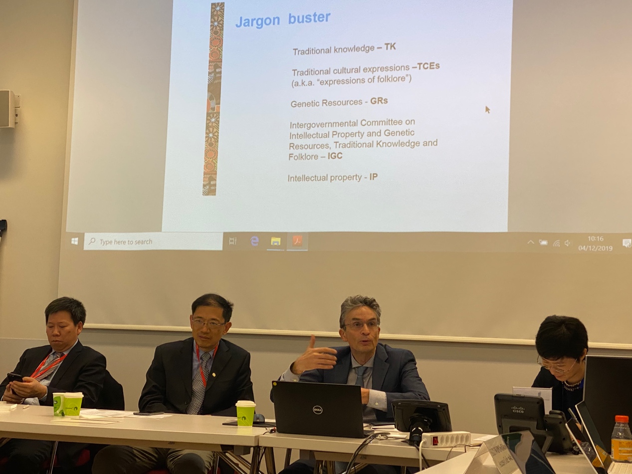 在两天的学习座谈中,世界知识产权组织先后派出四个部门的八位专家为同学们开设课程讲座并展开深入讨论。全球问题研究部门传统知识与全球挑战部传统知识司Simon Legrand先生介绍了世界知识产权组织知识产权与遗传资源、传统知识和民间文学艺术政府间委员会(IGC)的当前工作,就传统知识(TK)的定义、推动保护传统知识和反对保护传统知识的原因、利用现有知识产权制度保护和制定新制度保护的利弊等问题进行了讨论。