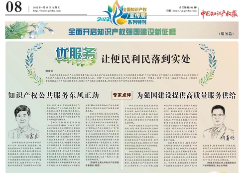 知识产权服务是知识产权工作的重要内容,为打通知识产权全链条提供全方位、专业化的服务支撑。《“十四五”国家知识产权保护和运用规划》提出,构建便民利民知识产权服务体系,促进创新成果更好惠及人民。回顾“十三五”时期,我国知识产权公共服务体系进一步健全。展望“十四五”,站在新的起点上,以信息化、智能化提高知识产权公共服务能力,促进知识产权服务业健康发展,将为实现知识产权事业高质量发展提供不竭动力。
