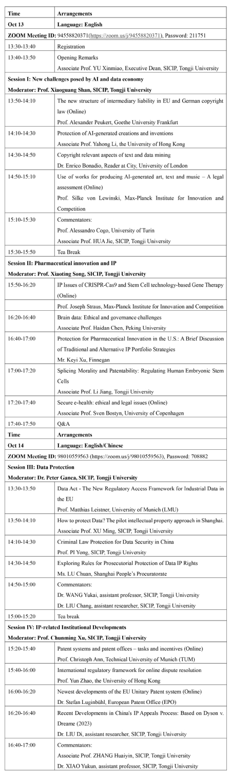 On October 13 – 14, 2023, SICIP will host the 5th Workshop on China-EU Innovation and Competition as one of the highlights of its 20th anniversary celebrations, and we cordially invite you to celebrate with us. The focus of the workshop will be on information technology related challenges for IP, competition law and innovation management, including artificial intelligence, big data, smart medicines, etc. It will emphasize internationally debated issues such as the growing conflict between different national policies and the lack of international harmonization in the field of data protection and data security, which are still subject matter of national legislation and can therefore become a formidable obstacle to international scientific research cooperation and cross-border business operations.